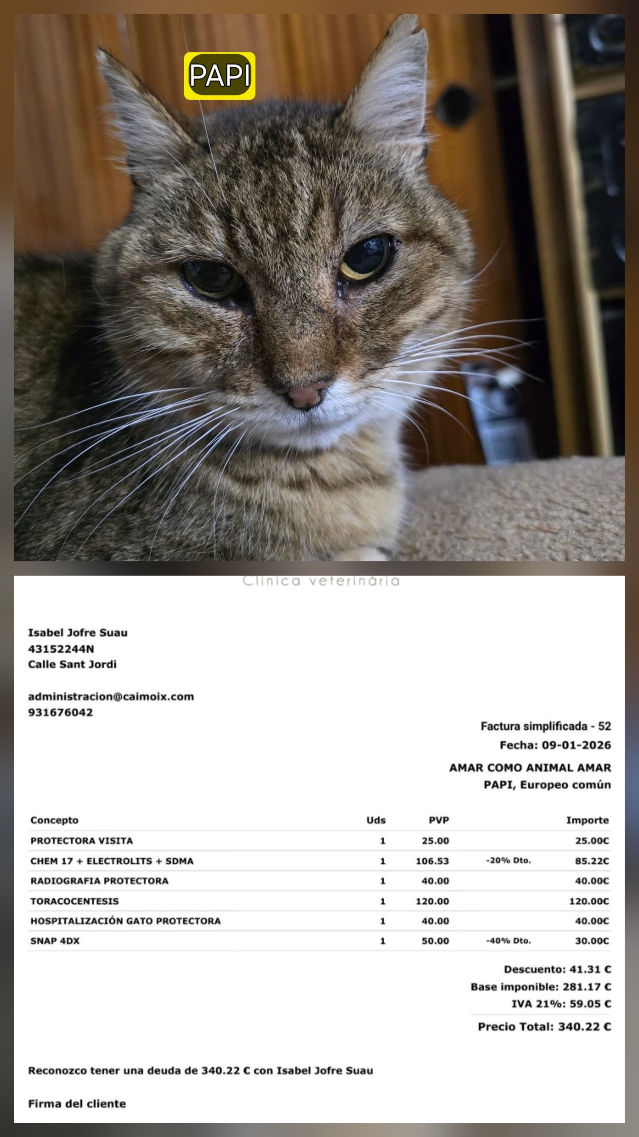 Tenemos muchos gatos mayores que necesitan muchos cuidados de por vida, tanto veterinarios, medicaciones y alimentos especiales y a esto se añade los últimos rescates que precisan mucha atención veterinaria.